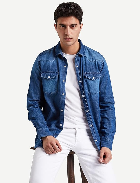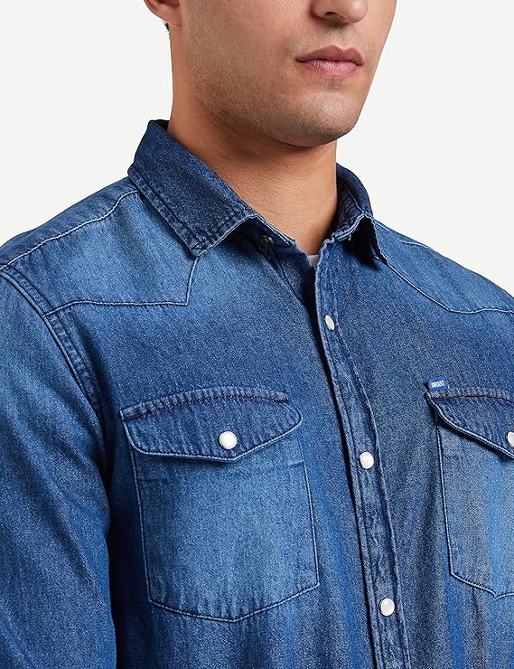 PRODUCT DETAILS: Regular-fit denim shirt featuring a regular collar, classic Western yoke detailing, double chest pockets, full sleeves, and a standard length for a rugged, timeless look.