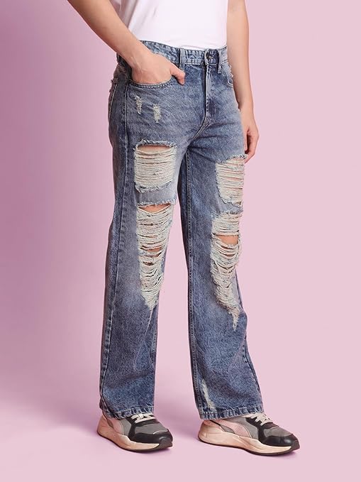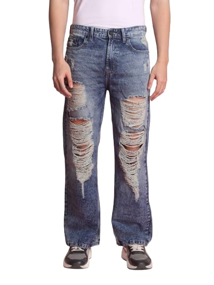 • STYLE: Distressed denim trousers featuring heavy ripped detailing and casual loose-fit design