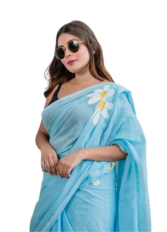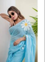 MATERIAL: Premium quality linen fabric saree in a vibrant lime green shade adorned with charming white daisy floral prints throughout