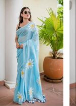 DESIGN ELEMENTS: Eye-catching white daisy motifs with yellow centres create a fresh, spring-inspired pattern on the saree