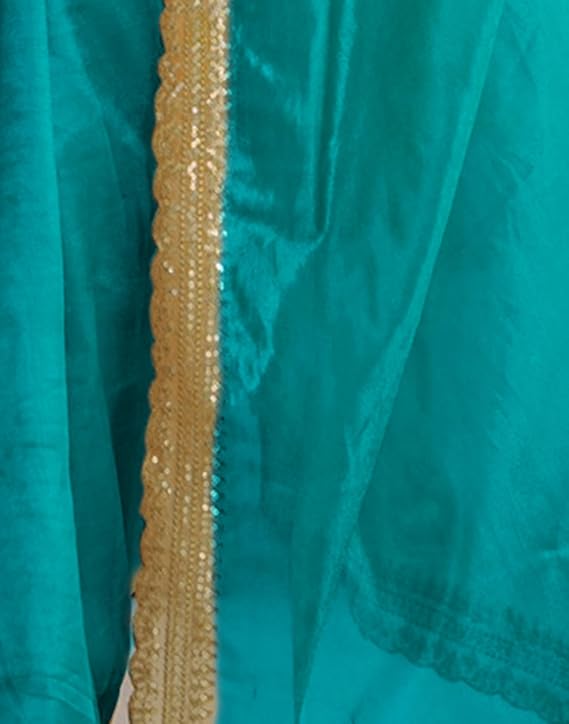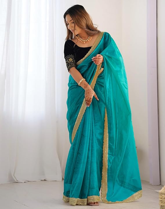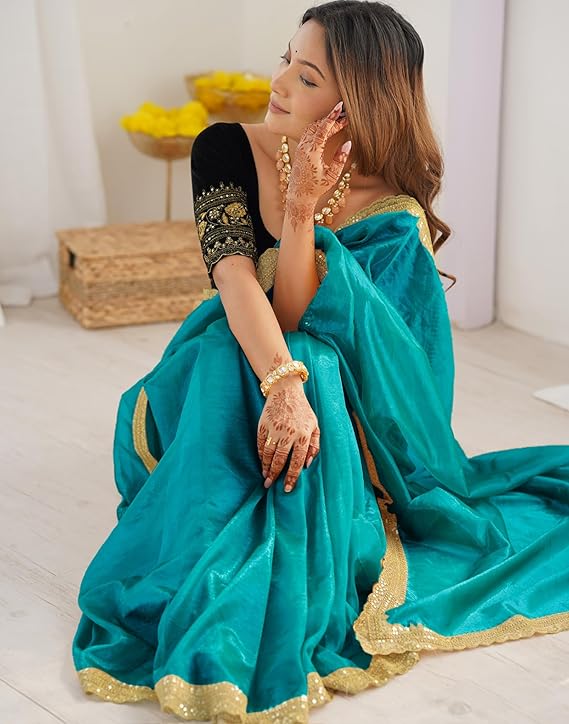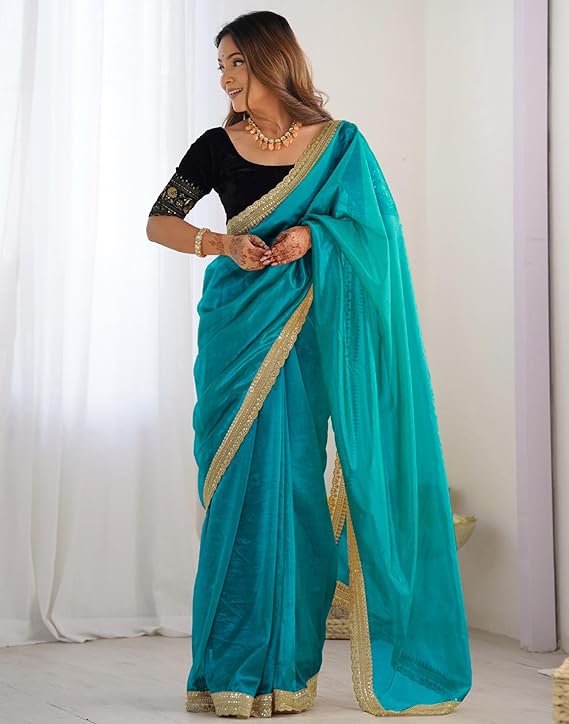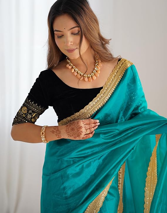 • Saree Fabric: Shimmer Net | Blouse Fabric: Velvet | Work:: Saree: Sequence Embroidery | Blouse: Sequins And Embroidery Border | Colour:: Saree Color: Turquoise | Blouse Color: Black