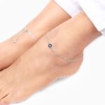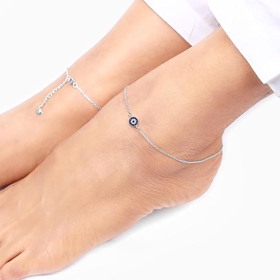 This silver anklet features a white and blue zircon studded evil eye design in the centre.