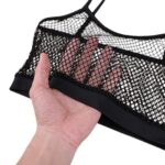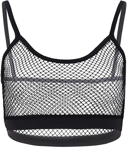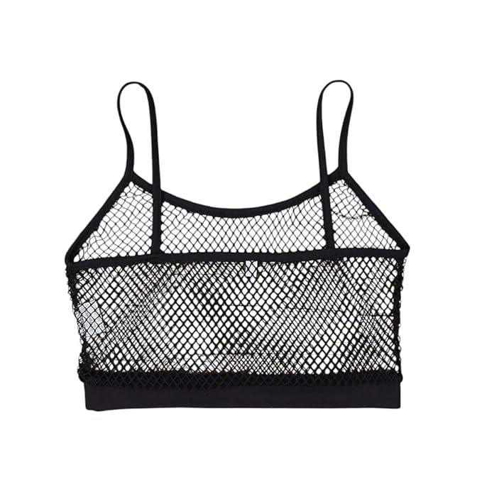 DESIGN: Stylish black fishnet mesh sports bra featuring a classic crop top silhouette with comfortable spaghetti straps and elastic band