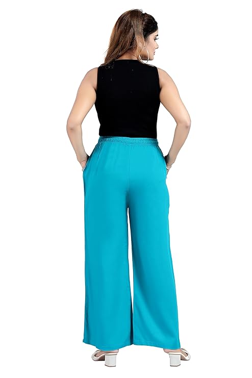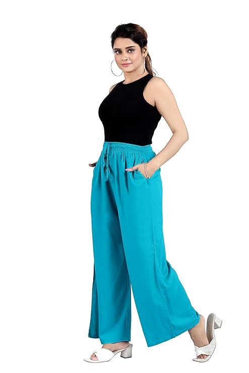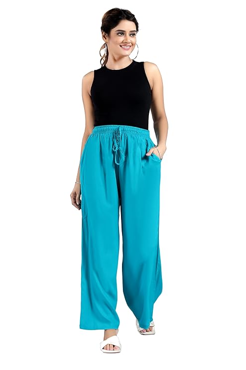 Our palazzos feature a mid-rise waist, Drawstring Closure and elasticized waistband with a concealed Hanging hook and side pockets. Designed full-length, our Cotton Rayon palazzos have solid spray which adds a contemporary look to your ensemble, making it perfect for any occasion