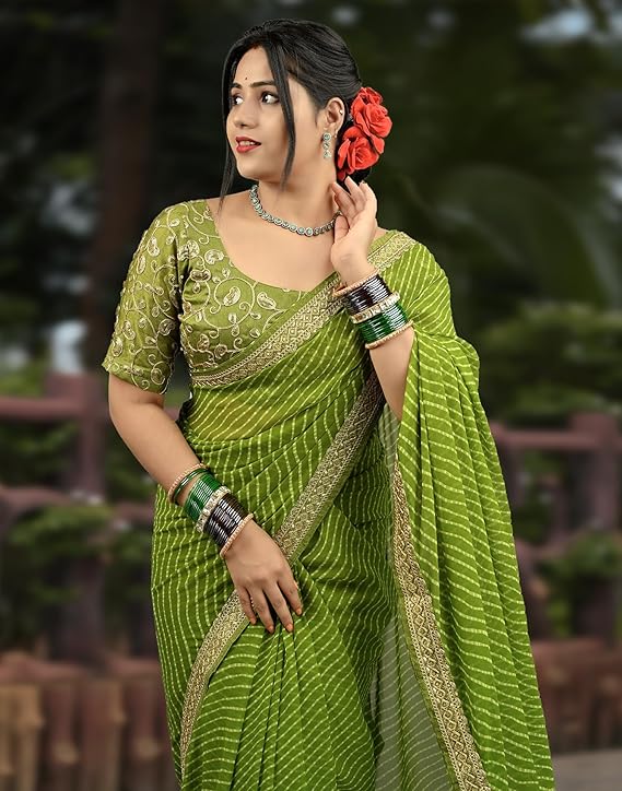Work Type :: Saree : Leheriya Printed & Lace | Blouse : Dyed, Embroidery Work | Wash Care: dry & clean is Recommernded.