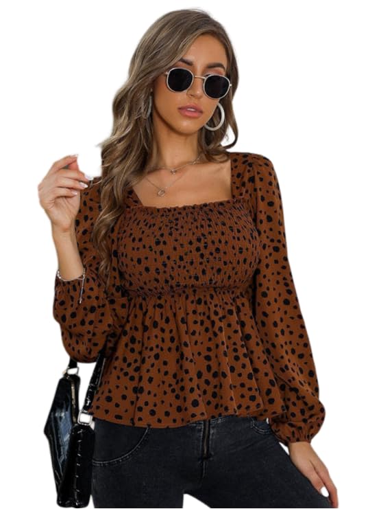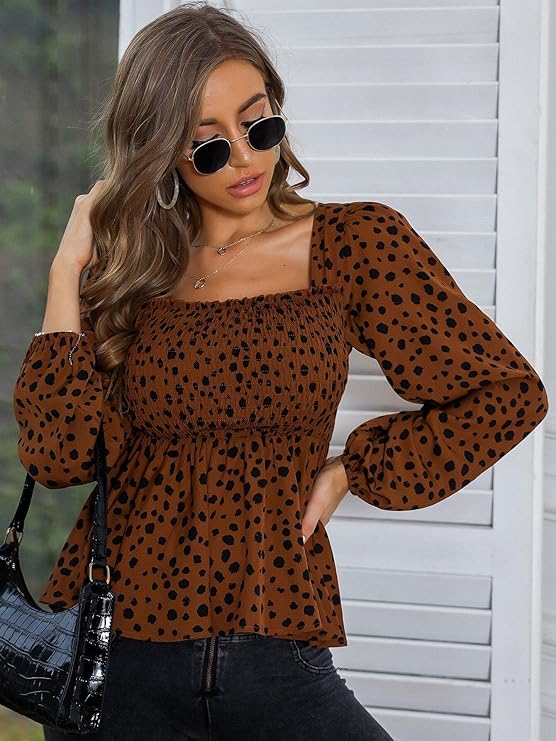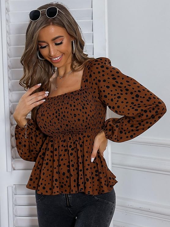 Square neck dressy long sleeve smocked peplum top long sleeve blouse casual leopard print tops